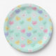 These cute party plates feature a retro style Valentine's Day theme. The background is a light teal paper pattern. Pastel coloured Valentine candy hearts are pictured with various sayings, messages, and love notes.