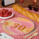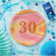 Retro 60s and 70s aesthetic, abstract pattern in vintage colours: pink and orange. Fun, cool, unique, funky design; a little bit trippy. Swirling waves of beautiful colour. Can be personalized with birthday number. By Kierkegaard Design Studio.
