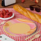 Retro 60s and 70s aesthetic, abstract pattern in vintage colours: pink, orange, and yellow. Fun, cool, unique, funky design; a little bit trippy. Swirling waves of beautiful colour with a 1960s vibe. By Kierkegaard Design Studio.