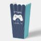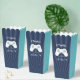 Designed to match our Level Up birthday party invitations and accessories, this retro gamer themed favour box features a game controller illustration on a navy blue background with "[Name] has reached level [age]" in vintage digital style lettering.