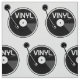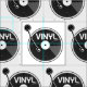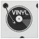 A black and white, vector illustration of a vinyl LP, record on a turntable or record player. The record has vinyl written on it.