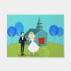 This Retro Wedding Couple Door Mat will have you hearing wedding bells. The 1960's style, minimalist art design features a bride and groom on their wedding day. The happy couple looks good enough to be standing atop a wedding cake. But they aren't. They're standing on lush, green grass. The debonaire Mr. is wearing a classic, black tuxedo with black bow tie. Down, ladies! He's taken! He is holding the hand of his beautiful Mrs., who looks positively radiant in her tea length, white gown with form fitting waist and flared skirt. She truly looks like a princess with her tiara and gauzy, white wedding veil resting on her pretty blonde head. Beside them, a path in the grass leads to the world's most charming chapel. The quaint, teal and turquoise church is the perfect setting for saying, "I do!" Yes, here is the church. Here is the steeple. We can only assume that, behind those bright red, double doors is a roomful of people just waiting to share in this couple's happiness. The picturesque setting also includes four, stylistic, cartoon trees in shades of blue. It's a beautiful day for a wedding, as we can see from the flawless aqua sky. The only thing missing from this mid century modern design is the rice, and we can assume that will be forthcoming. This design is ideal for congratulating your favourite newlyweds.