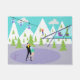 This Retro Winter Ski Resort Door Mat has something for everyone. The picturesque cartoon drawing features a snow-covered mountain range with green cedar trees. A lone skier, wearing red, orange, and royal blue, can be seen swooshing down the tallest mountain. Snow is continuing to fall from clouds in the turquoise sky. We can see the silhouettes of happy people whizzing by in ski lift gondolas. Perched above the trees, there is a mid century modern, elevated ski chalet. Through the glass walls, we can see a dark haired beauty resting in bright purple egg chair. She is wearing a green sweater, navy blue pants and a cumbersome white cast on one leg. Don't feel too sorry for her. She's enjoying the warmth of an olive green, cone shaped fireplace with a roaring fire. She also has an awesome view of a couple of romantic ice skaters on a frozen, purple ice rink. The man of the duo is wearing a black jumpsuit with a yellow turtleneck. His hands are wrapped around his partner's waist. She's a gorgeous redhead whose hair is in a ponytail. She is wearing an ice blue top and short, flouncy, sea foam green skirt. They are having the time of their lives, but let's hope they notice the crack in the ice.