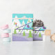 This Retro Winter Ski Resort Wrapping Paper has something for everyone. The picturesque cartoon drawing features a snow-covered mountain range with green cedar trees. A lone skier, wearing red, orange, and royal blue, can be seen swooshing down the tallest mountain. Snow is continuing to fall from clouds in the turquoise sky. We can see the silhouettes of happy people whizzing by in ski lift gondolas. Perched above the trees, there is a mid century modern, elevated ski chalet. Through the glass walls, we can see a dark haired beauty resting in bright purple egg chair. She is wearing a green sweater, navy blue pants and a cumbersome white cast on one leg. Don't feel too sorry for her. She's enjoying the warmth of an olive green, cone shaped fireplace with a roaring fire. She also has an awesome view of a couple of romantic ice skaters on a frozen, purple ice rink. The man of the duo is wearing a black jumpsuit with a yellow turtleneck. His hands are wrapped around his partner's waist. She's a gorgeous redhead whose hair is in a ponytail. She is wearing an ice blue top and short, flouncy, sea foam green skirt. They are having the time of their lives, but let's hope they notice the crack in the ice.