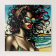 Pretty retro African American woman in bikini sitting on beach with sunglasses on in vintage colours in a pop art comic style.