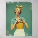 A cheerful, vintage-inspired woman forms a heart with her hands, radiating warmth and positivity. Her bright yellow top, matching headscarf, and classic retro styling pop against the textured teal background. With a joyful smile and nostalgic charm, the artwork captures a timeless expression of affection and upbeat energy.