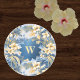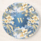 This tropical look coaster features a retro hibiscus flower, palm trees, and blue pattern. It's reminiscent of classic Hawaii or Tahiti, almost like a tropical shirt pattern. Your monogram initial appears in yellow against a blue floral background, which has a simulated brushed metal look, in the center. This nostalgic design might remind you of tropical beaches and relaxing waves whenever you see it. Make sure to type your initial in the Personalize section.