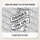 A simple black and white design that will stand out on coffee tables, this wedding save the date coaster features an illustrated hand drawn look. A banner in the middle of the coaster reads "drinks on us" and sits on a lined background. There is space along the top and bottom of the coaster to personalise with your own wedding details.
