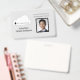 Reusable Horizontal Employee ID name tag with light grey background and framed employee photo.All elements are changable or removable. Elements: company logo, company tagline,employee photo, employee name, employee department. Quality magnetic fitting won't damage clothes.