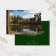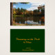 Cette jolie carte de commerce d'artiste présente une jeune femme assise et rêvant sur le quai au bord d'un grand étang. L'automne est dans l'air. L'eau est entourée d'arbres aux magnifiques couleurs feuillues d'automne, jaune, vert, rouge, orange et or. Le ciel bleu est couvert de nuages blancs et tout cela se reflète dans l'eau. Le tronc d'un grand pin définit le côté gauche. Le brillant soleil se reflète dans ses cheveux rouges.