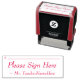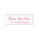 This respectable rubber stamp design features the message "Please Sign Here", along with a line that a signature or initials could be written above. It also features a personalized educator’s or teacher’s name. It could be be used by a tutor, teacher or educator to ask a student’s parent(s) or guardian(s) to review and acknowledge the grade that a student got on an exam, a project, an essay, a test, or some other school assignment.