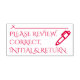 This elegant rubber stamp design features the message "PLEASE REVIEW, CORRECT, INITIAL & RETURN", along with a line where a signature or initials could be written above. It might be be used by a teacher or an administrative professional to request that somebody review and acknowledge the contents of a document or some other paperwork.