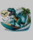 Illustration ludique d'un T-Rex chevauchant une planche de surf sur une vague géante, avec un palmier et des mouettes en arrière - plan. design amusant et humoristique avec un dinosaure profitant du style de vie sur la plage. image colorée et dynamique d'une créature préhistorique embrassant le monde moderne.