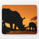 A silhouette of a rhino mother and her calf drink from the local water hole while the sun sets behind them. Computer art by Kathie Miller