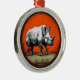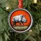 Stylized depiction of a rhinoceros presented in a circular format. The rhino is displayed in a dynamic pose, showcasing its prominent horn and robust body. The background is a vivid orange colour, which contrasts with the black edges of the circle, creating a striking visual effect. The ground beneath the rhino is illustrated with subtle details, resembling a textured landscape. Surrounding the rhino are thorny bushes or stylized vegetation. The overall style combines realism with artistic flair, producing an eye-catching and impactful composition.