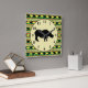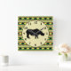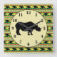 Black and yellow rhinos march across green stripes alternating with loosely “woven” stripes in African inspired colours of red, black and green with yellow accents in the pattern that embellishes this wall clock along with a silhouette of a rhinoceros and black numbers on a pale yellow background.