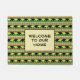 Black and yellow rhinos march across green stripes alternating with loosely “woven” stripes in African colours of red, black and green with yellow accents on this easy to customize welcome mat.