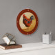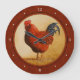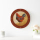 Rhode Island Red Chicken Rooster standing in the dry grass on a warm sunny summer day. Accented with a matching rustic barn red patterned background.