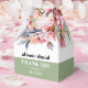 This wedding favor box displays a beautiful rhododendron branch adorned with delicate peach-pink flowers and greenery. The couple's names are elegantly displayed in bold typography, adding a personal touch to the design. A heartfelt 'Thank You' message is also included, expressing gratitude to the guests. Completing the look, a stylish sage green band adds a touch of sophistication at the bottom of the box.