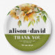 Rhododendron orange yellow flowers typography fall wedding Paper Plate. This elegant wedding paper plate showcases a beautiful rhododendron branch adorned with delicate orange yellow flowers and greenery at the upper part. The couple's names are prominently displayed in bold typography, adding a personal touch to the design. A heartfelt message of 'Thank You' is also included, expressing gratitude to the guests. Completing the look, a stylish olive green band gracefully adorns the bottom of the napkin, adding a touch of sophistication to any wedding celebration.