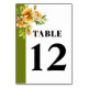 Rhododendron branch with orange yellow flowers wedding table number card. Elevate your wedding reception with this beautifully designed table number card, featuring a delicate watercolor rhododendron branch adorned with orange yellow blossoms and green leaves. Positioned in the upper left corner, the botanical illustration creates a romantic, eye-catching focal point. An olive hreen border along the left side adds a refined touch of elegance, while bold, stylish typography ensures excellent readability.