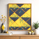 This artwork showcases a vibrant grid of rhombus shapes, each split diagonally into contrasting halves of bright yellow and deep grey. Across the surface, energetic splashes of vivid blue and small yellow spots break the rigid geometry, adding movement and spontaneity. Thin orange lines outline each rhombus, enhancing the structure while allowing the playful, abstract paint effects to stand out. The repeating arrangement creates a harmonious balance between precise form and expressive chaos.