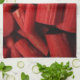 This kitchen towel features closeup fine art photography of rhubarb stalks (Rheum rhabarbarum) cut up and ready for pie or sauce. The arrangement of pieces and lovely red colour create an interesting abstract pattern. Sometimes considered a fruit and sometimes a vegetable, this herbaceous perennial is one of the first spring edibles in the garden. The roots are used in traditional Chinese medicine.