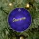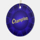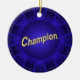 This ornament is decorated on one side with a blue ribbon rosette bearing the word "Champion" in gold coloured lettering and on the reverse with easy to customize text.