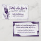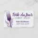 Eating, dining fork with bow business cards for personal or private chefs, caterer or catering, cooking classes or culinary instruction; in greys and purple with scratchy linen background and decorative swirls.