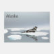 A digital painting of a brown and white Ribbon Seal resting on an ice floe on a very grey and dreary day. Customizable text reading "Alaska" also appears. The ribbon seal (Histriophoca fasciata) is a medium-sized pinniped from the true seal family (Phocidae). They are among the most striking and easily recognizable. They can be identified by the distinctive light-coloured bands or “ribbons” that encircle their neck, each foreflipper, and hips. The contrast is particularly strong with the males,having a dark brown to black pelage with white ribbons, females range from silvery-grey to dark brown with paler ribbons. Newborn ribbon seal pups have white natal fur. After moulting their natal fur, their colour changes to blue-grey on their backs and silvery beneath; after some years some portions become darker and others brighter, and only at the age of four years does the typical design show. Ribbon seals moult their coat of hair annually, beginning in May and finishing in July, with younger individuals molting earliest. The ribbon seal has a large inflatable air sac that is connected to the trachea and extends on the right side over the ribs. It may function as a buoyancy device, for air storage during diving, or for "phonation." It is larger in males than in females. The ribbon seal can grow to about 5.2 ft long and weigh up to209 lb in both sexes. Ribbon seals alternate their foreflippers and swing their hindquarters to run across ice, rather than using the caterpillar-like movement typically used by most seals. Ribbon seals are also physiologically and anatomically adapted to make deeper dives (up to about 1950 ft (600 m)) and swim faster than other seals. They have an air sac that Ribbon seals are a seasonally ice-bound species found in the Arctic and Subarctic regions of the North Pacific Ocean, notably in the Bering Sea and Sea of Okhotsk, and adjacent parts of the Arctic Ocean, including the Chukchi Sea, eastern Siberian Sea, and western Beaufort Sea. These seals are relatively solitary, spending most of their time in the open ocean and forming loose aggregations in the pack ice during spring to give birth, nurse pups, and moult. They are very rarely seen on shorefast ice or land. This species seems to prefer moderately thick, “clean” ice floes found in the inner zone of the ice front. From late-March to early-May, ribbon seals in the Bering Sea range from the Pribilof Islands to Gulf of Anadyr, roughly along the continental shelf break, being more abundant in the northwestern ice front. As the ice recedes during May to mid-July, the seals move farther to the north where they haul out on the receding ice edge and remnant ice, occasionally in dense groups. After the ice has melted, most ribbon seals probably either migrate with the receding sea ice through the Bering Straight into the Chukchi Sea or remain pelagic in the Bering Sea during the rest of the year. Thus far, there have been only two acknowledged instances where ribbon seals have been found as far south as Seattle, Washington and even further south at Morro Bay, California. There was nothing to suggest that illness was the cause of either seals appearance at either place, as both appeared to be healthy. Ribbon seal mothers give birth to their pups far offshore in the pack ice during April to early-May. The pups double their weight during nursing and are weaned after three to four weeks. Mating likely occurs shortly after weaning, though little is known of the breeding system. Ribbon seals are known to eat a variety of fishes, cephalopods, and crustaceans; however, information about their feeding habits is limited and mostly restricted to the spring when ribbon seals are typically feeding less, as evidenced by their decreased weight and blubber thickness. Although there is little direct evidence of predation, potential predators of ribbon seals include polar bears, killer whales, sharks, and walruses. Ribbon seals are relatively unwary while hauled out and can be approached closely by boat. This behaviour suggests that ribbon seals probably do not experience much predation by polar bears, but may also make them especially susceptible to hunting by man. Siberia and Alaska Natives have hunted the ribbon seal for many generations for subsistence, and the current annual take by Alaska Natives is estimated to be less than 200 seals per year. Commercial harvests of ribbon seals were conducted by Soviet sealers in the 1960s to 1980s, during which time the Bering Sea population is thought to have declined from 80,000 or 90,000 animals to 60,000. Surveys during the early and mid-1970s put the worldwide population estimate of ribbon seals between 200,000 and 240,000, with estimates ranging between 60,000 and 100,000 in the Bering Sea. A more recent and reliable abundance estimate is not currently available. Predators of the ribbon seal include orca, the Greenland shark and polar bears. In the 1960s, the population of ribbon seals in the Bering Sea was reduced from about 120,000 to 70,000. The population size increased back to about 130,000 in 1987 after quotas were set to limit harvest to about a fourth of the number of seals hunted previously. In the latest stock assessment (2007), the National Marine Fisheries Service estimated a global population size of 240,000 ribbon seals, 90,000-100,000 of which inhabit the Bering Sea. In the Okhotsk Sea, the average number of ribbon seals was 370,000 between 1968 and 1988. The current population trend is unknown, but recent estimates suggest that no catastrophic declines have occurred in recent decades. Humans have hunted ribbon seals for generations and are still hunted today by Siberia and Alaska natives for subsistence, but the number of seals harvestedhas always been relatively small (less than 100 in Alaska). In the early 1950s, the USSR began commercially harvesting ribbon seals in the Sea of Okhotsk ; the fishery quickly intensified in the 1960s,with an average of about 13,000 to 
