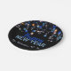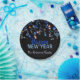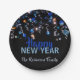 Personalized New Year paper plate design featuring shiny ribbons and bokeh lights on a black background. The text is fully customizable.