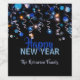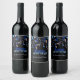 Personalized New Year wine label design featuring shiny ribbons and bokeh lights on a black background. The text is fully customizable.