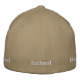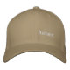 Fits well due to elastic edging, not adjustable. Good qualty material. Good quality embroidering. Subtle lettering (white on beige) just as my wife likes.