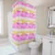 Ajout coloré pour le bain ! Ce rideau de douche présente un dessin carrelé d'une silhouette de libellule en or, rose et violet.
