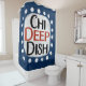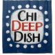 Un design de message typographique amusant et mignon qui dit "Chi Deep Dish". Il a du texte noir et rouge sur un rectangle blanc avec des points blancs amusants autour, le tout sur un arrière - plan bleu.