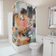 un collage abstrait fort et audacieux sur un rideau de douche... de magnifiques fragments peints d'art moderne. orange et corail, noir, vin, aqua et lavande.