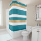 rideau de douche en tissu élégant, dans une motif rayée turquoise, blanche et dorée moderne. Des accessoires de salle de bain correspondants sont disponibles.