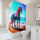 Ce rideau de douche a une licorne sur elle.