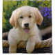 Un jeune chien chiot-eyed mignon de golden retriever dans un panier en osier parmi des fleurs dans un jardin. Ce rideau en douche est une idée enchanteresse de cadeau pour des doglovers. Un jeune chiot de Goldie de cutie photographié par Katho Menden. http://www.zazzle.com/kathom_photo