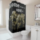 Rideau en douche de ranch de troupeau de bovins. Le beau troupeau graphique colorized de bétail frappent une pose sur ce rideau en douche noir contrasté qui soutient le sentiment "à la maison est où le troupeau est." Audacieux et beau ce sera un gagnant de ruban bleu en votre ranch ou ferme.