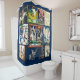 Les dessins et les illuminations des documents médiévaux décorent ce rideau en douche. Il a des chevaliers, des châteaux, des dragons, des bateaux, des chevaux, des anges, et d'autres choses prises des imaginations des moines et des manuscrits médiévaux. La couleur d'arrière - plan est bleu-foncé.