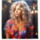Ce rideau de douche a une jolie dame de l'IA photographiée dessus.