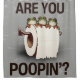 Cute bathroom design "Are You Pooping?" design depicts a watercolor illustration of 3 frogs sitting on a roll of toilet paper and staring. This grey, green and white washroom design makes a nice gift for anyone who likes frogs and funny toilet posters.