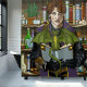 Un jeune sorcier mâle tenant un vieux livre avec un mignon petit dragon vert en haut du livre. Derrière, une bibliothèque remplie de livres, potions, chaudron, boule de cristal et plantes.