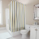Rideau de douche rayé moderne et élégant. Les couleurs sont gris, noir, jaune doré et blanc.
