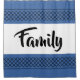Rideau de douche bleu famille. Arrière - plan bleu foncé avec motif noir amusant en haut et en bas. White est au centre avec le mot Famille dans une jolie typographie amusante. Amusant et élégant !