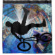 L'action de sports et l'énergie des athlètes de BMX exécutant des tours et des cascades d'extrémité sur leurs vélos. Cette image montre un cavalier exécutant un saut de cascade au milieu d'un tunnel bleu grunge avec la pointe d'épingle de la lumière