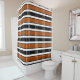 Ce rideau de douche a un design géométrique d'un plaid aux lignes marron et blanc sur un arrière - plan noir.