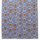 Ce rideau de douche a un design géométrique de cercles en rangs avec des cercles ou ovales à l'intérieur en marron sur un champ de bleu.