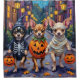 L'adorable Chihuahuas habillé de costumes d'Halloween ludiques porte des seaux citrouilles tout en trompant ou en traitant sous le ciel illuminé par la lune. Ce design festif met en valeur la taille minuscule de la race, sa grande personnalité et son esprit animé, capturant à merveille l’atmosphère éffrayante et ludique de la nuit d’Halloween. Une charmante fête pour les amoureux de les chiens comme pour les fans d'Halloween.